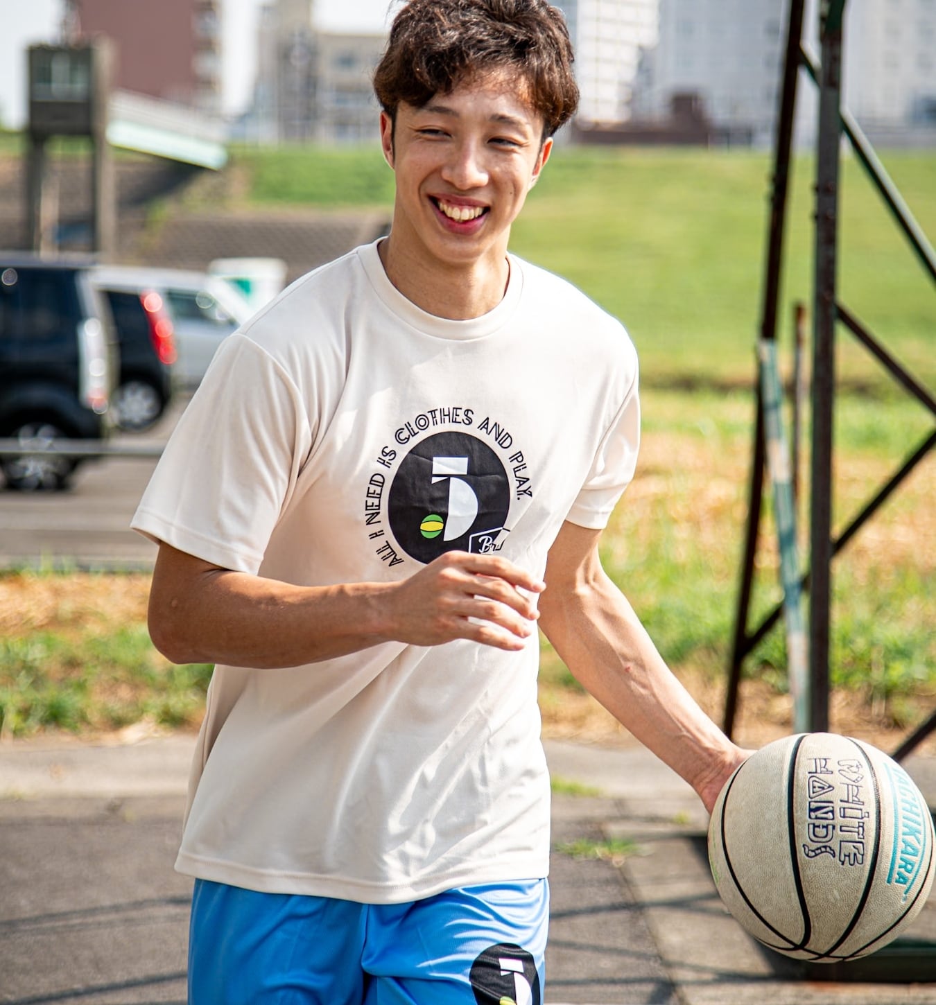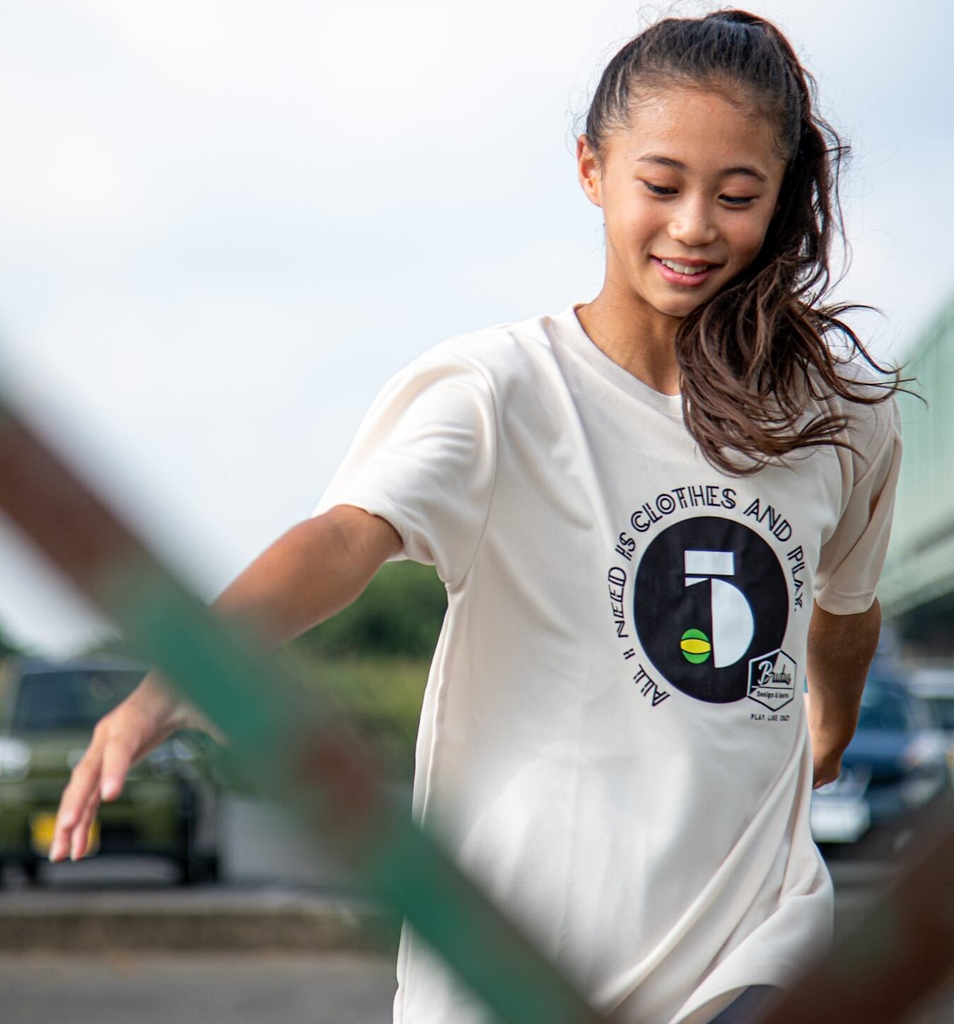 【 ALL I NEED IS CLOTHES AND PLAY 】はメインロゴを囲むように。ドライTシャツ、フロント全面に合わせたフォントを使用することで一体感を演出。